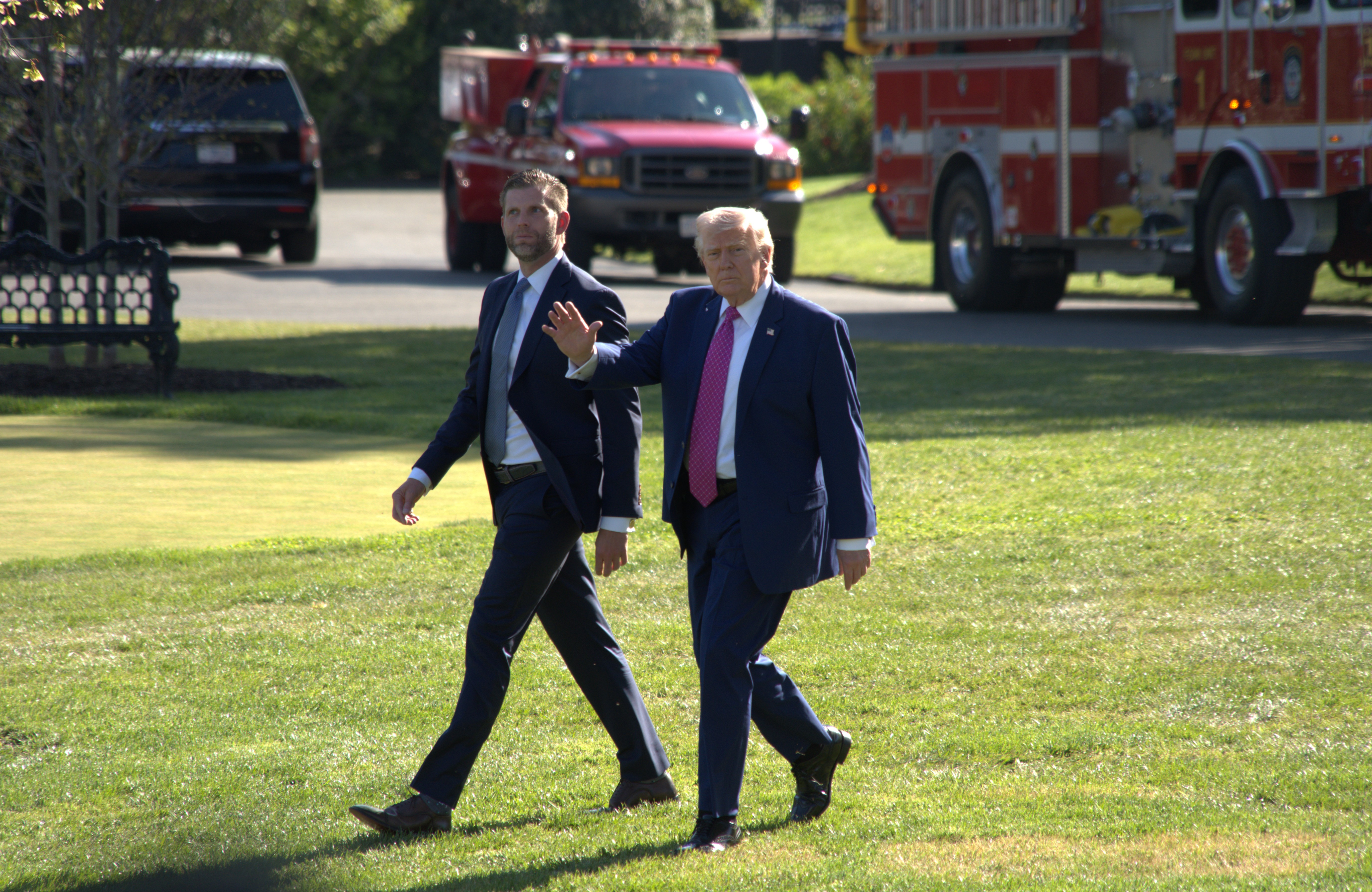 4月10日,美国总统特朗普(右)准备乘直升机离开华盛顿白宫。新华社 发